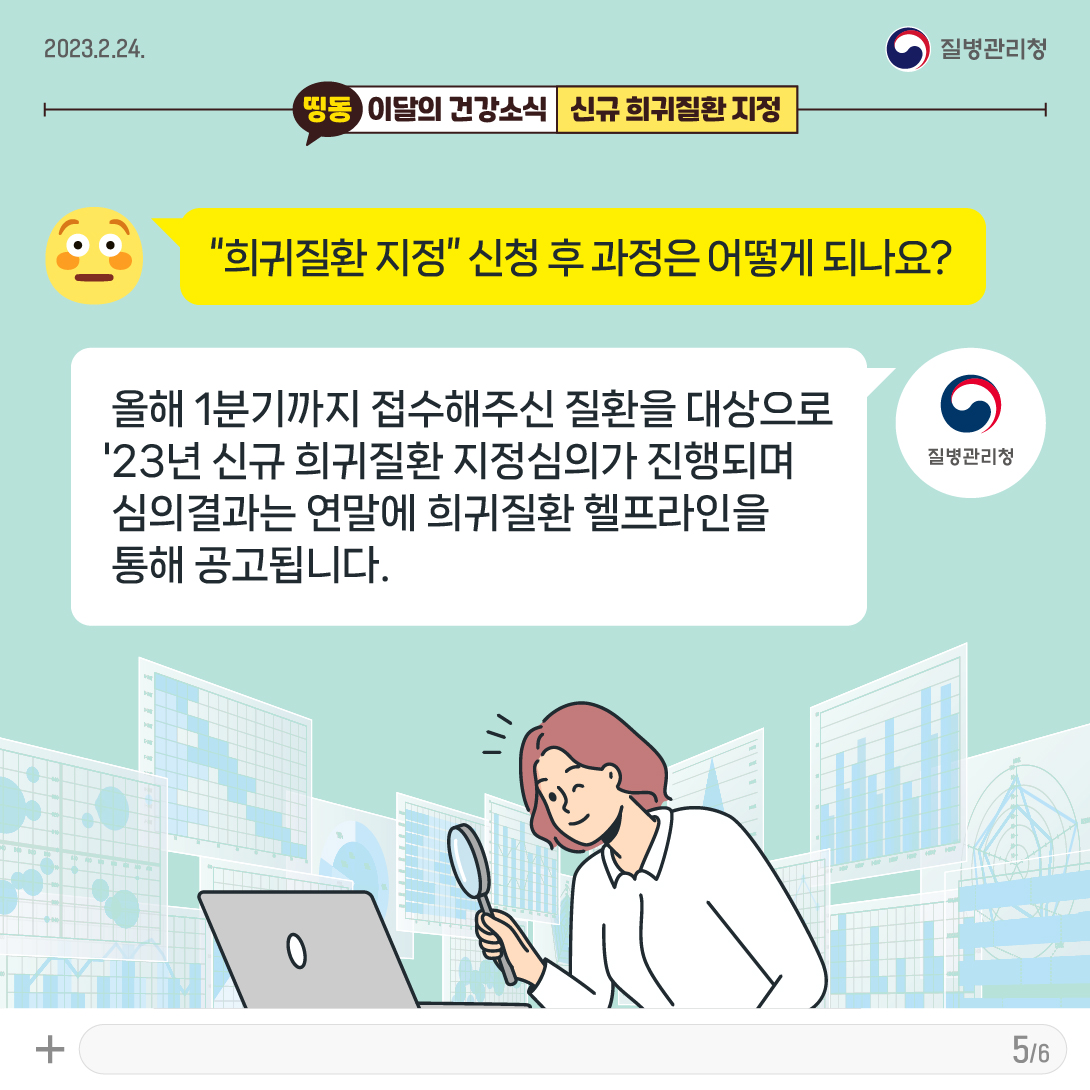 - 올해 1분기까지 접수해 주신 질환을 대상으로 '23년 신규 희귀 질환 지정심의가 진행되며, 심의결과는 연말에 희귀 질환 헬프라인을 통해 공고됩니다.