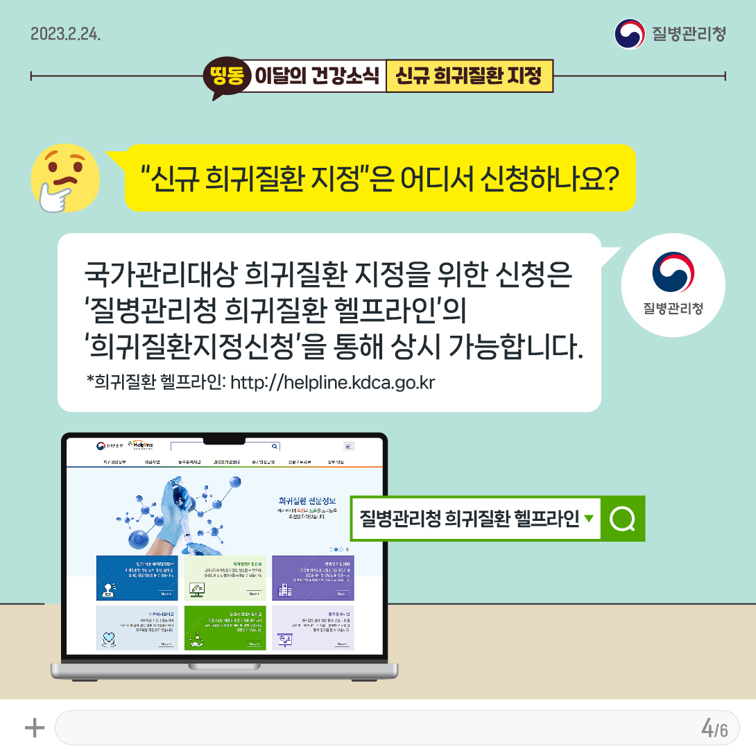 - 국가관리대상 희귀 질환 지정을 위한 신청은 "질병관리청 희귀 질환 헬프라인"의 "희귀 질환 지정 신청"을 통해 상시 가능합니다.